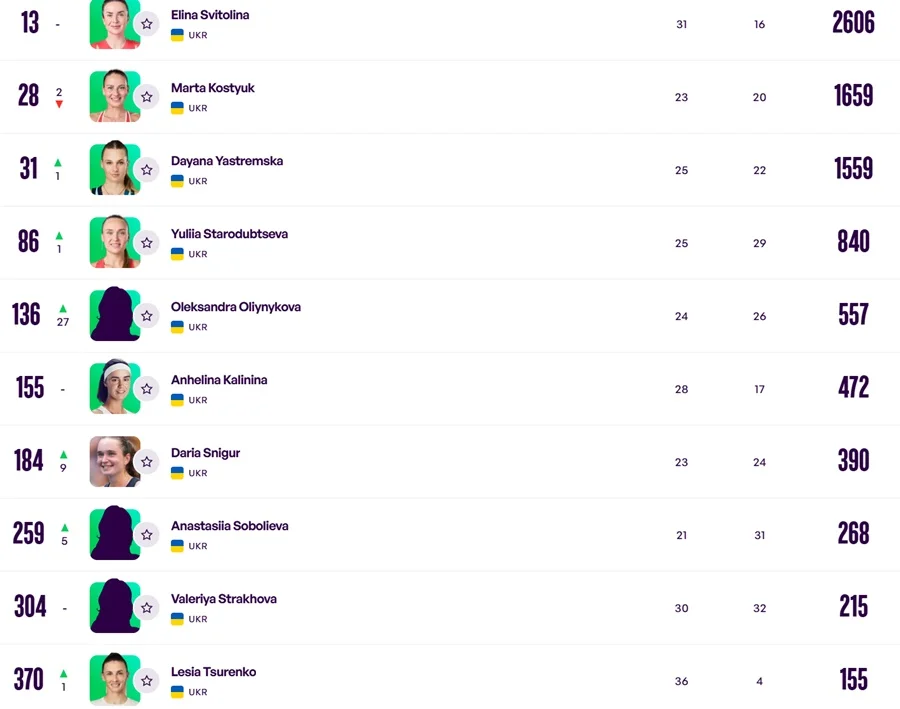 Еліна Світоліна залишається першою ракеткою України, посідаючи у рейтингу WTA 13-ту позицію. Найкраща українська тенісистка має у своєму активі 2606 залікових балів.