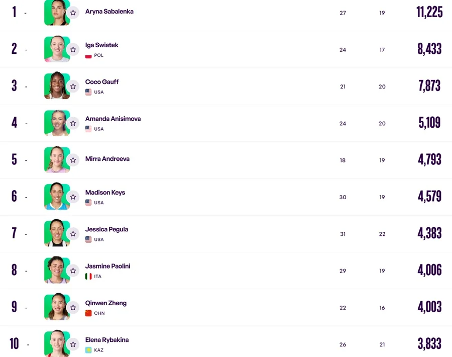У першій десятці світового реєстру не відбулося жодної зміни. Лідером залишається Аріна Соболенко. У топ-3, як і до цього, входять Іга Свьонтек з Польщі та Коко Гофф зі США.