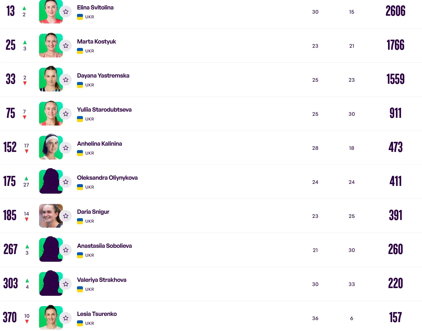 Даяна Ястремська (33-те місце), Юлія Стародубцева (75-те місце) та Ангеліна Калініна (152-те місце) відкотилися у рейтингу, а ось Олександра Олійникова (175-та позиція), навпаки, додала. Прогрес Олійникової склав 27 місць.
