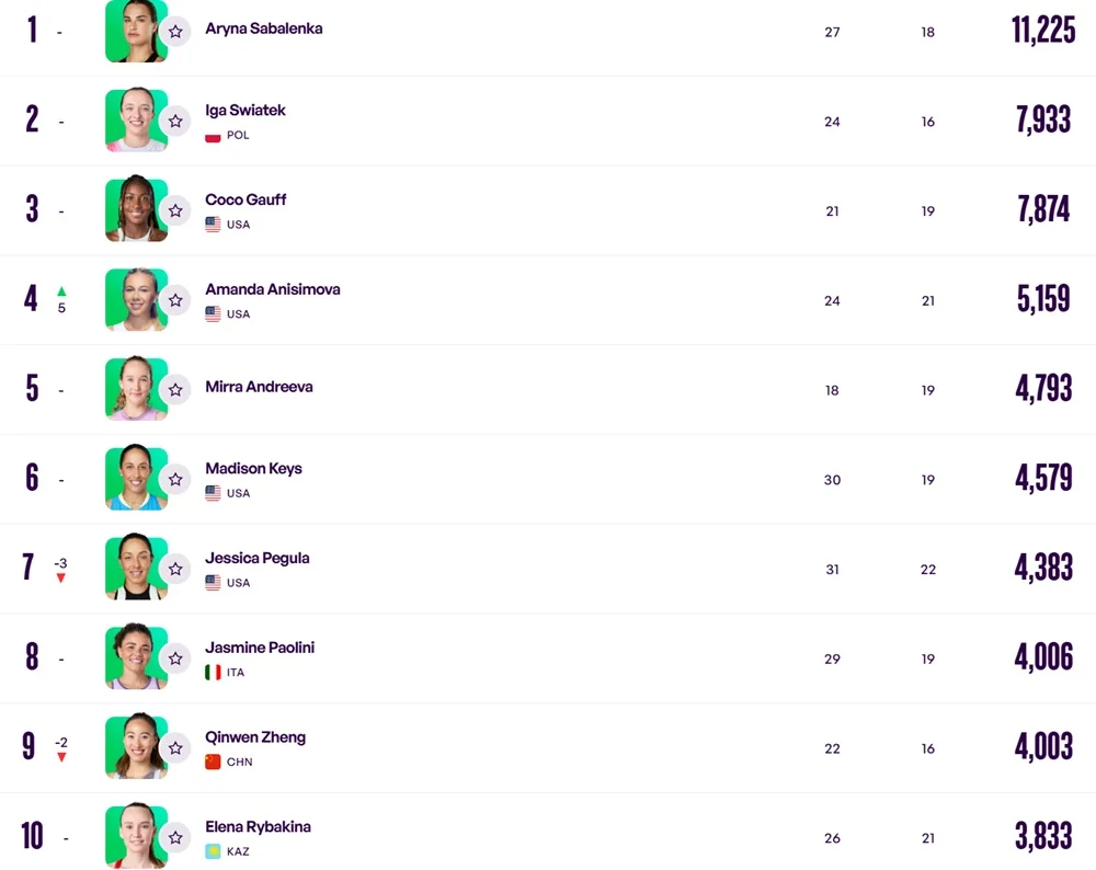 У першій десятці рейтингу WTA Аріна Соболенко залишається на першій позиції. До топ-3, як і раніше, входять Іга Свьонтек та Коко Гофф. На четверте місце з дев’ятого піднялася Аманда Анісімова – фіналістка US Open-2025. Американка Джессіка Пегула впала на сьоме місце з четвертого. Чжен Цінвень вже не сьома, а дев’ята.