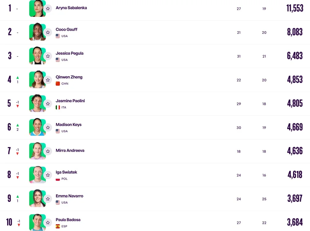 Лідером реєстру залишається Аріна Соболенко. Як і раніше до топ-3 входять Коко Гофф та Джессіка Пегула. Сім інших тенісисток з першою десятки змінили свої позиції.