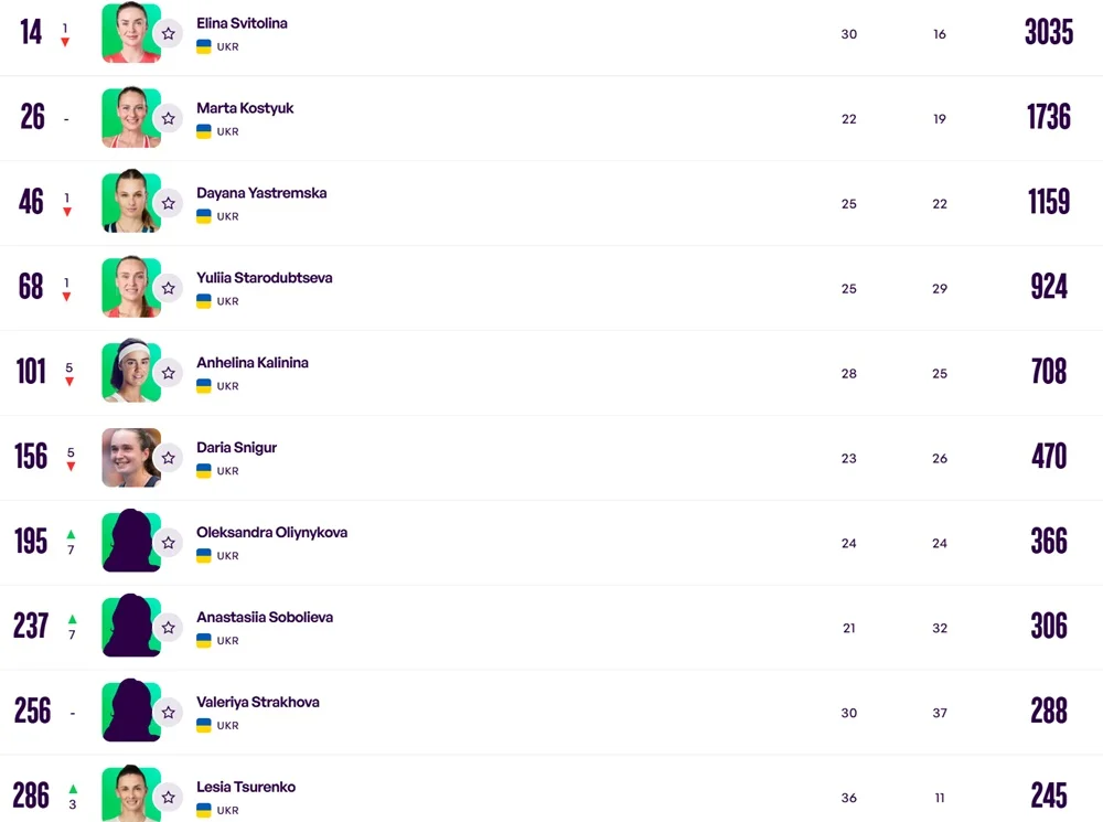 Марта Костюк залишилася на 26-й сходинці реєстру, а ось Даяна Ястремська та Юлія Стародубцева втратили по одній позиції.
