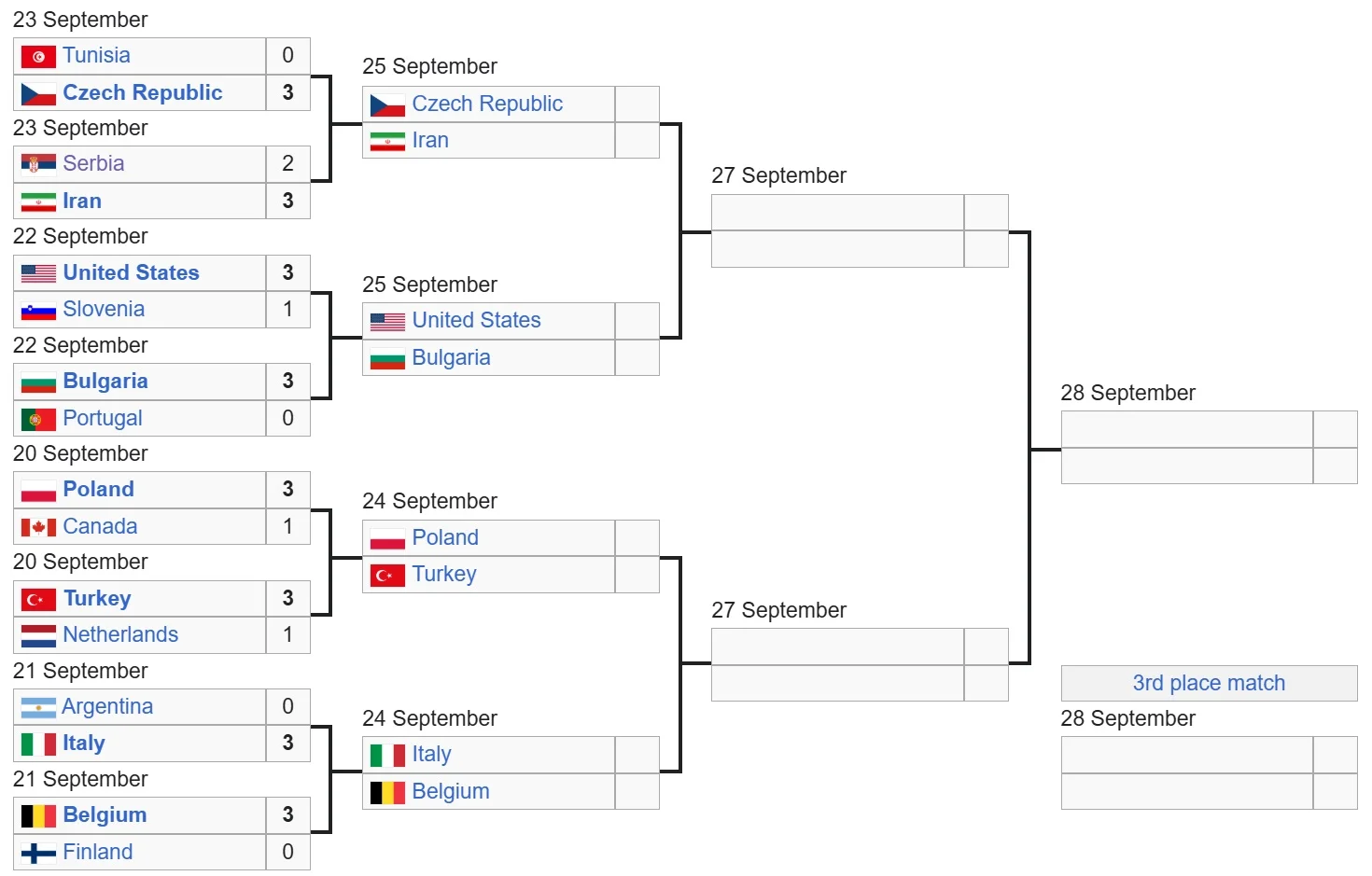 Команда Ірану у чвертьфіналі зіграє зі збірною Чехії. В інших парах зустрінуться США та Болгарія, Польща та Туреччина, а також Італія та Бельгія.