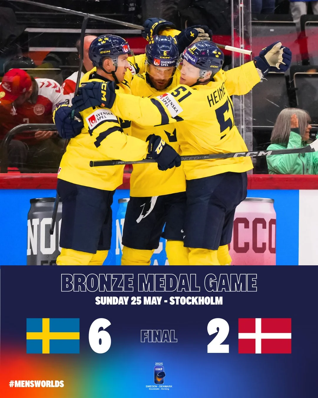 Швеція і Данія розіграли бронзу домашнього ЧС-2025 з хокею – призера визначив матч із вісьмома шайбами