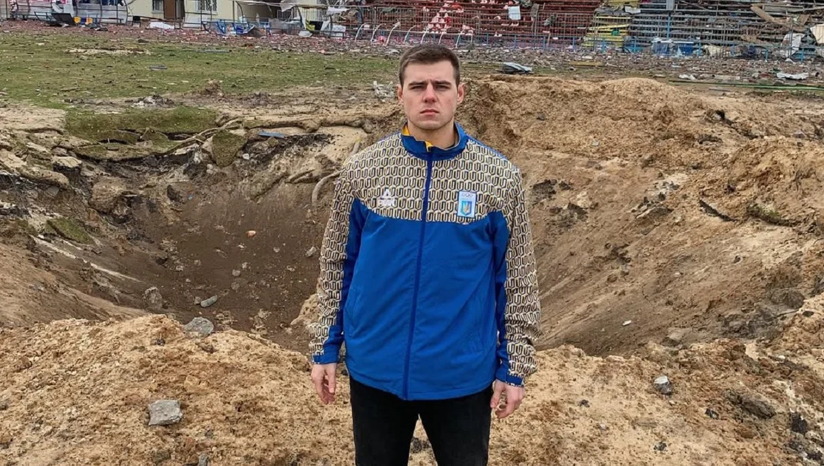 Гераскевич на тлі зруйнованого росіянами стадіону в Чернігові / Фото зі соцмереж
