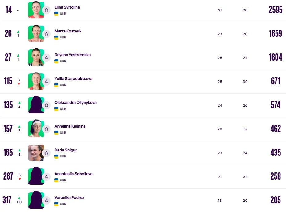 Перша ракетка України Еліна Світоліна залишилася на 14-му місці в рейтингу WTA. Марта Костюк та Даяна Ястремська піднялися на одну позицію кожна. Є приємні зміни для Олександри Олійникової, Ангеліни Калініної та Дарії Снігур. А ось Анастасія Соболєва та Юлія Стародубцева дещо втратили позиції.