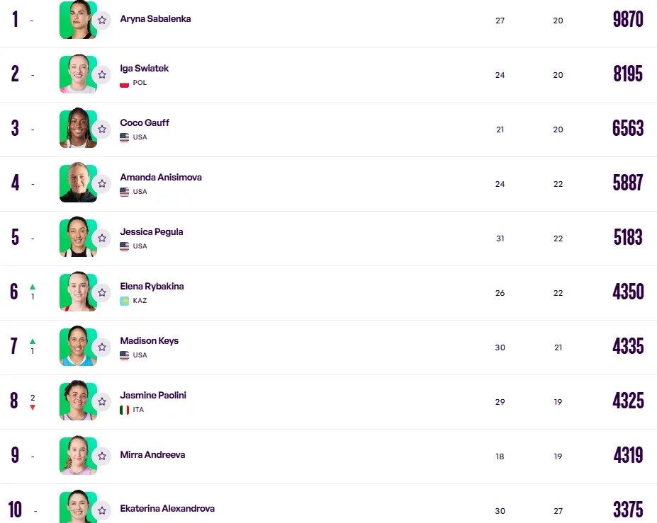 У топ-10 світового рейтингу майже без змін: "нейтральна" білоруска Аріна Соболенко залишається першою ракеткою світу, Іга Свьонтек та Коко Гофф замикають топ-3. Лише Жасмін Паоліні опустилась на дві позиції, пропустивши вперед Єлену Рибакіну та Медісон Кіз.