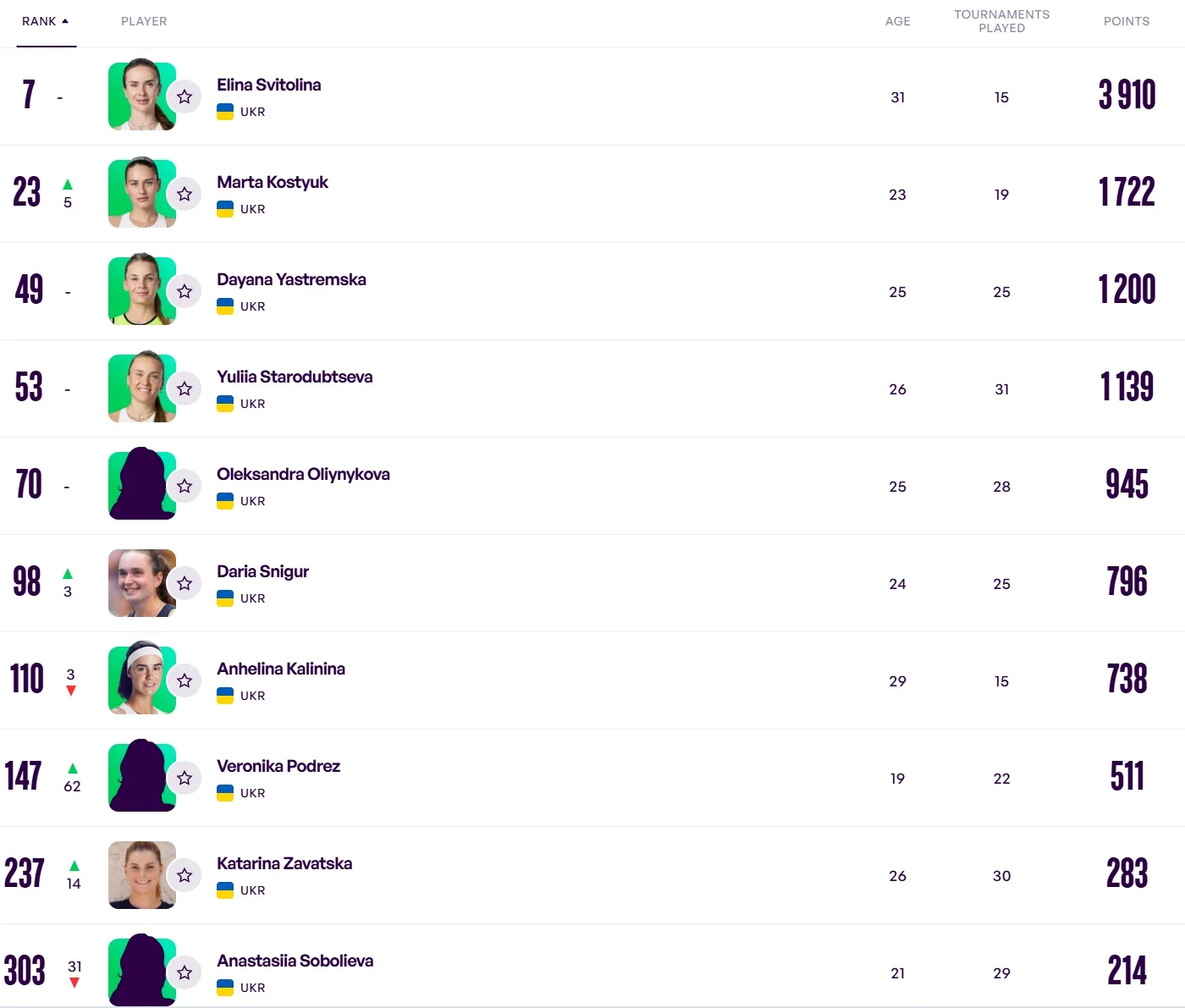 Ангеліна Калініна втратила три місця – у неї загальна 110-та позиція. Вероніка Подрез після фіналу на турнірі WTA 250 у французькому Руані минулого тижня здійснила підйом на 62 місця та посідає тепер 147-му позицію. Вона здобула право заявлятися у кваліфікації мейджорів – турнірів серії Grand Slam.