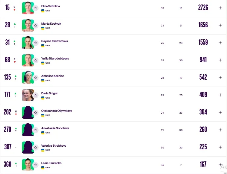 15. Еліна Світоліна (-2 позиції)