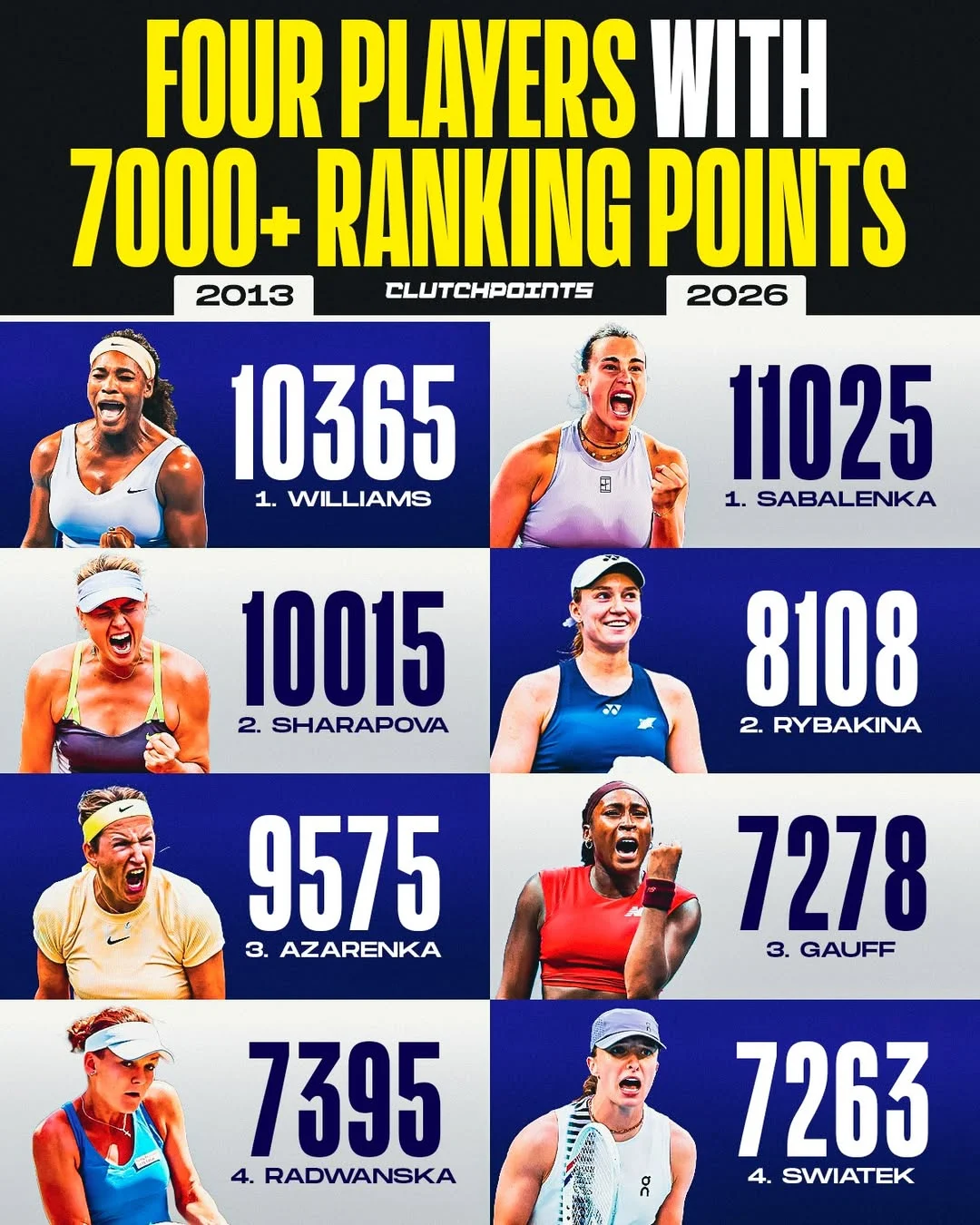 Аріна Соболенко, Єлена Рибакіна з Казахстану, Коко Гофф зі США та Іга Свьонтек з Польщі, які входять у топ-4 рейтингу Жіночої тенісної асоціації, повторили результат березня 2013 року, повідомляє Clutch Points Tennis.