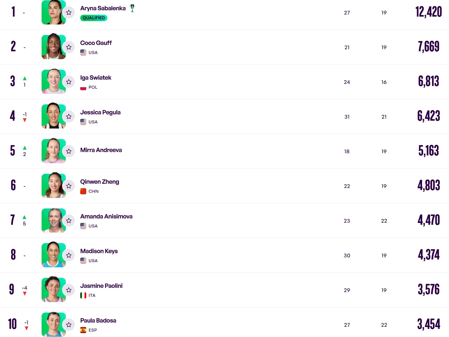 Першим номером світового рейтингу залишається Аріна Соболенко. Друга позиція в американки Коко Гофф. До трійки найкращих увірвалася представниця Польщі Іга Свьонтек – чемпіонка Вімблдону-2025. Фіналістка трав’яного мейджора Аманда Анісімова піднялась у топ-10 – вона посідає сьому позицію.
