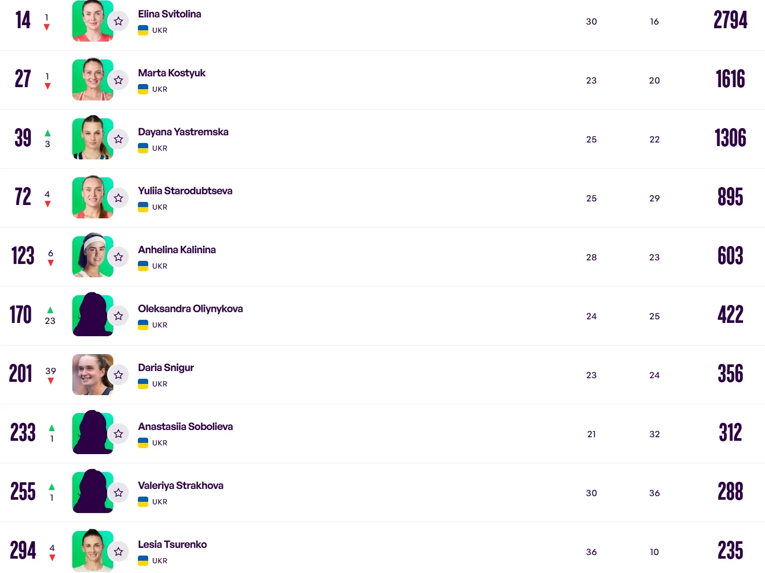 Юлія Стародубцева та Ангеліна Калініна зробили відкат назад. Для Калініної падіння вже є нормою – вона втрачає позиції у кожному новому рейтингу. Натомість Олександра Олійникова піднялася на 23 місця та посідає зараз 170-ту позицію. Дарія Снігур втратила 39 рядків – вона випала з топ-200 (201-е місце).