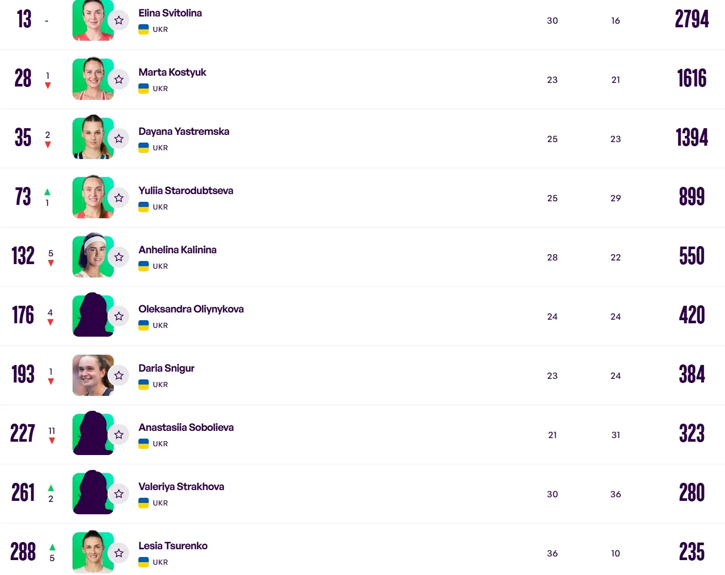 Еліна Світоліна залишається першою ракеткою України. Крім того, вона, як і до цього, посідає 13-ту позицію у світовому реєстрі, маючи 2794 очки.