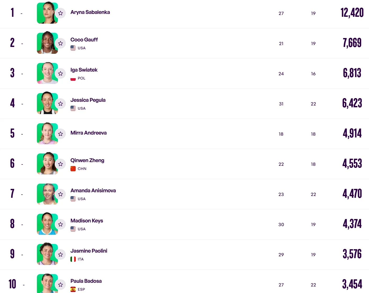 У першій десятці реєстру WTA не відбулося жодної зміни. До топ-3, як і раніше, входять Аріна Соболенка, американка Коко Гофф та представниця Польщі Іга Свьонтек.