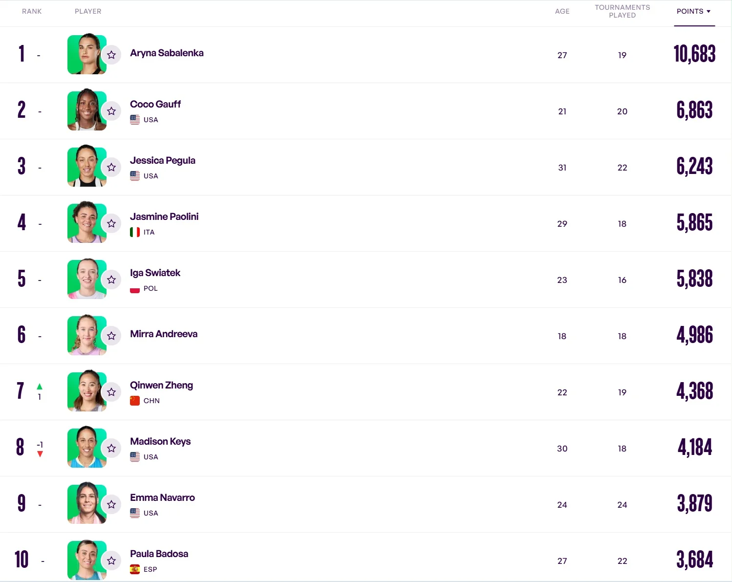 У першій десятці світового реєстру відбулася тільки одна зміна: місцями помінялися Медісон Кіз зі США і Чжен Ціньвень із Китаю. У топ-3, як і до цього, входять Аріна Соболенко, Коко Гофф і Джессіка Пегула.