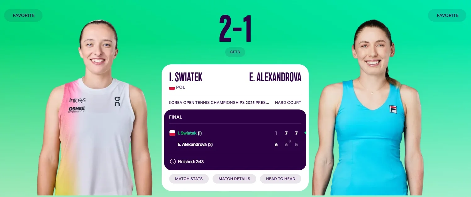 Іга Свьонтек та Єкатеріна Александрова зустрілися у фіналі турніру WTA 500 у Сеулі (Корея). Результат та звіт – у цій новині "Футбол 24+".