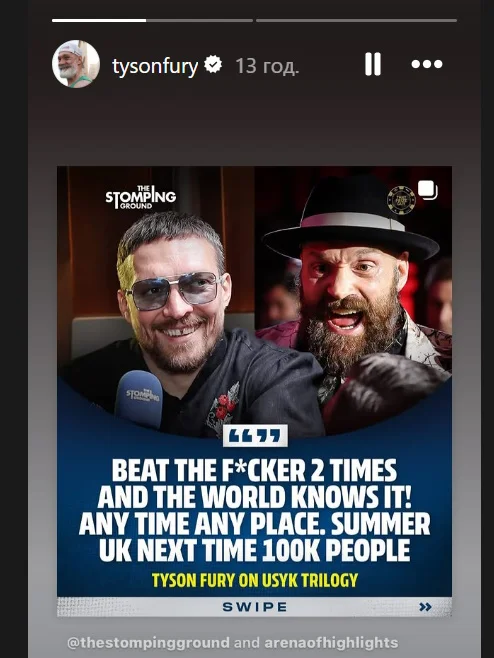 "Я переміг цього уб**дка двічі. Весь світ про це знає. Я готовий у будь-який час, у будь-якому місці. Наступний бій – Британія, 100 тисяч людей", – написав Ф'юрі в Instagram.