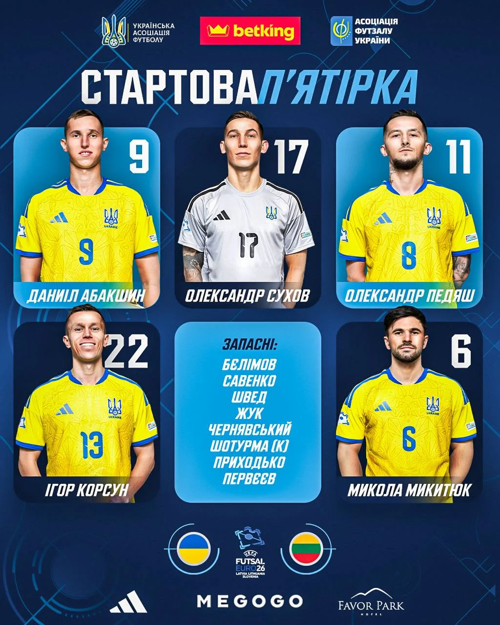 Збірна України оголосила склад на матч проти Литви в рамках Євро-2026 з футзалу.