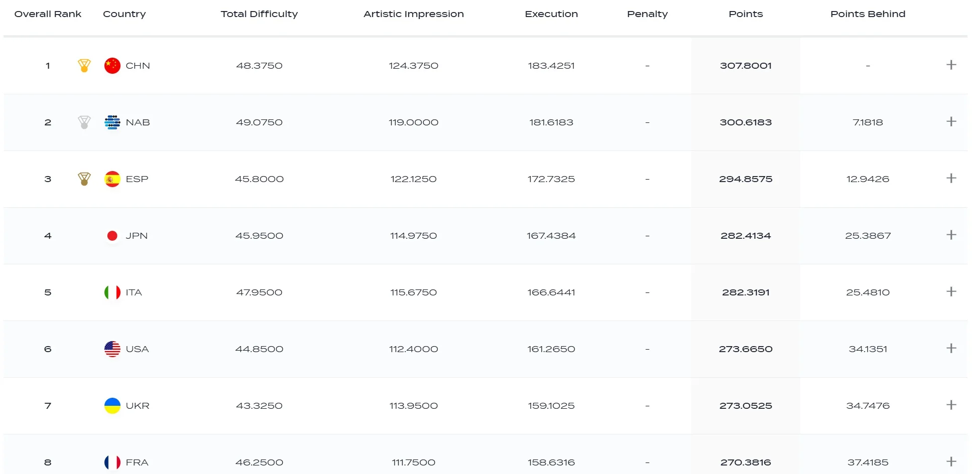Першими фінішували китаянки, які відстояли звання чемпіонок світу в технічній командній програмі. На подіумі разом з ними розташувалися так звана "нейтральна" команда Б (представниці Росії) та збірна Іспанії.