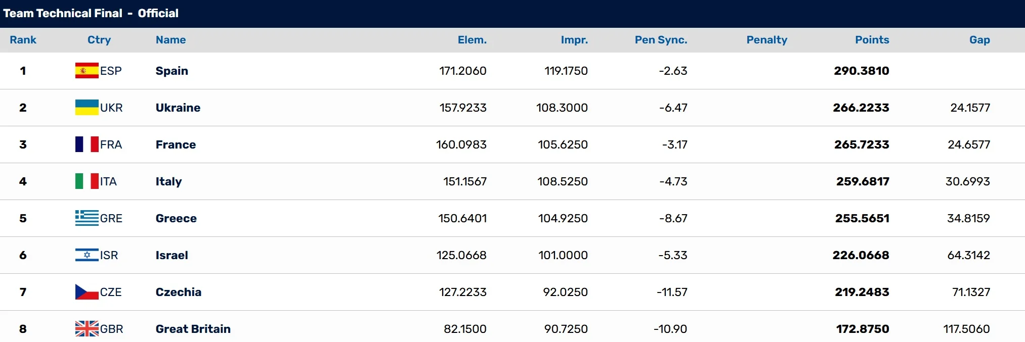 Чемпіонками Європи стали іспанки. За свій виступ вони отримали 290,3810 бали. Це відразу на 24,1577 бала більше, ніж заробили українки.