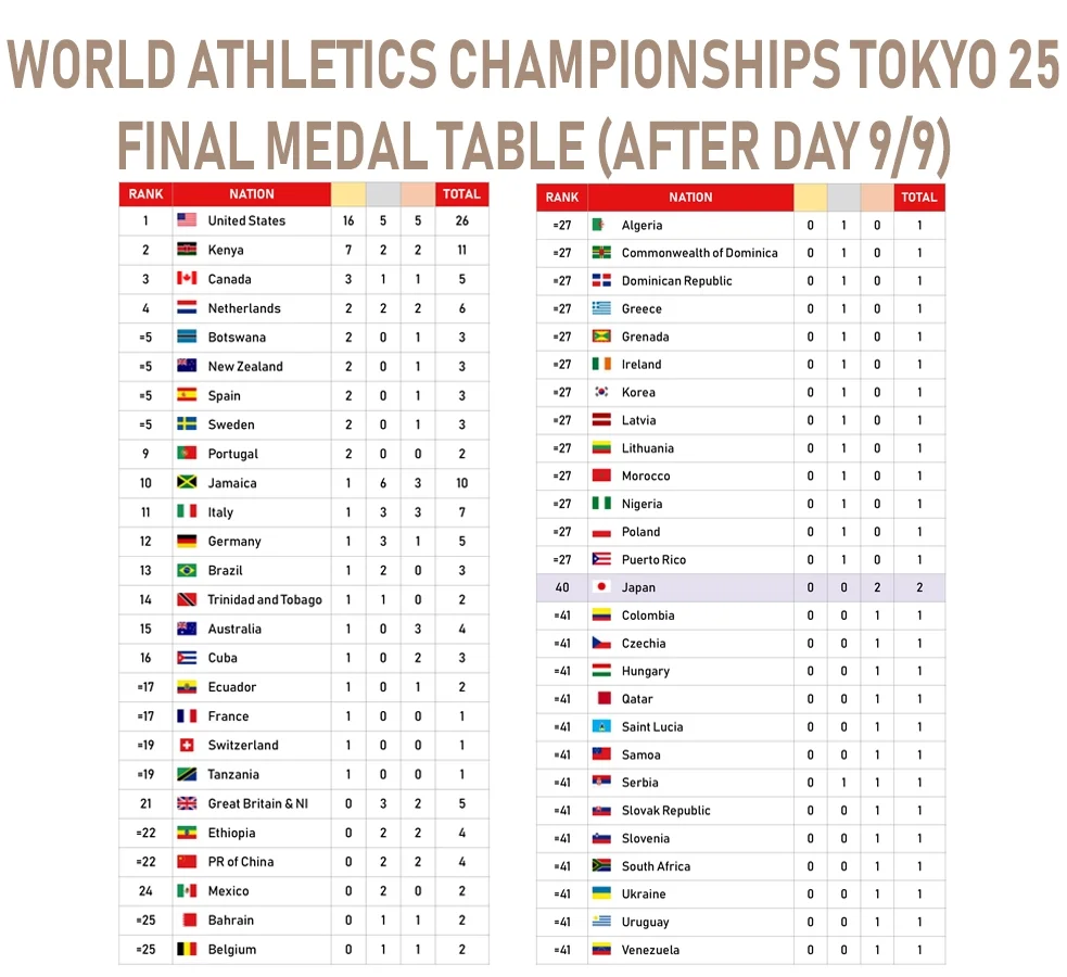 Україна посіла 41-ше місце в медальному заліку чемпіонату світу-2025 з легкої атлетики.