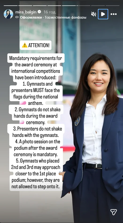У художній гімнастиці можуть запровадити нові правила поведінки під час церемоній нагородження. Про це повідомила тренерка та суддя збірної Казахстану Меруерт Балгінбаєва, оприлюднивши перелік змін, які вже доводять до учасників міжнародних стартів.