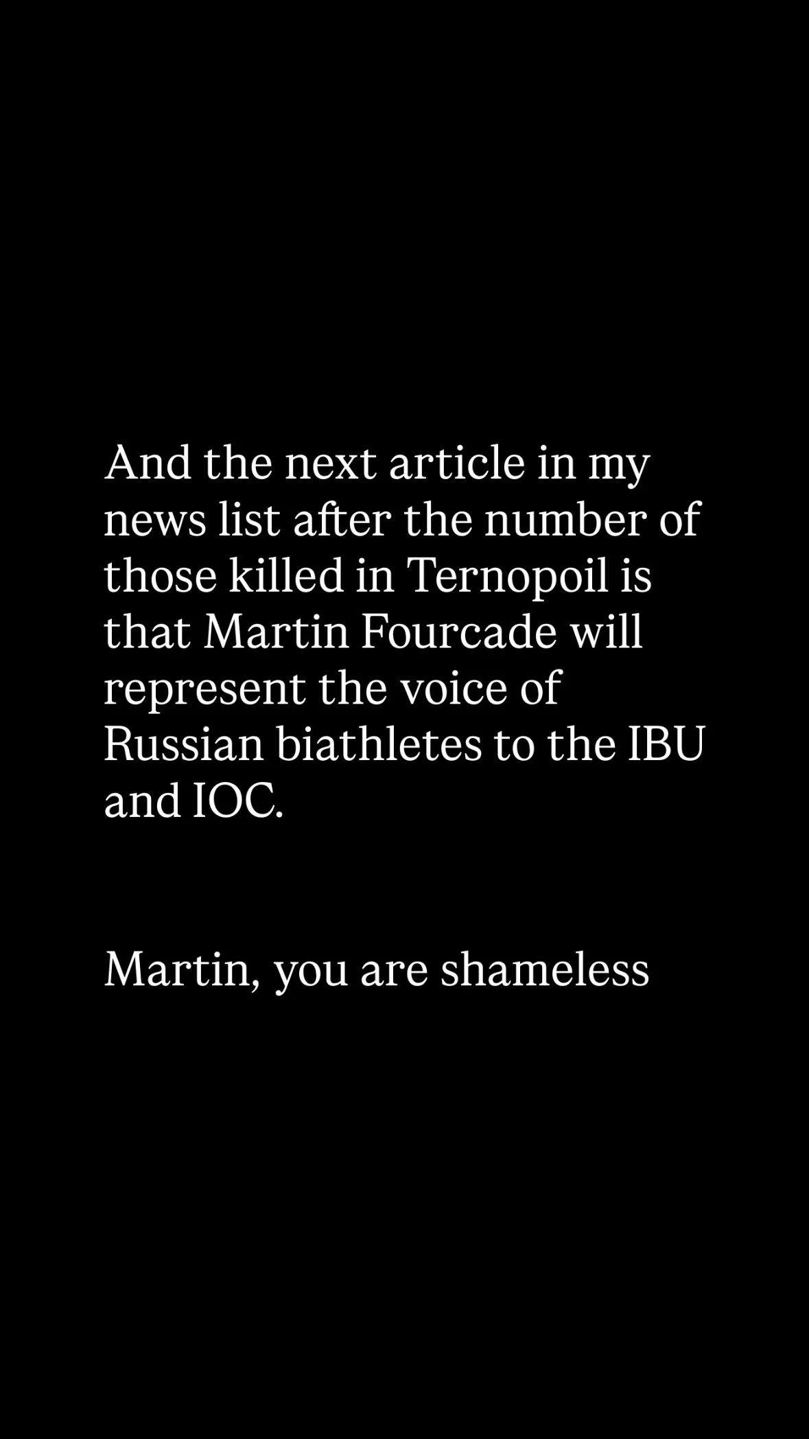 "І наступна стаття в моєму списку новин після кількості загиблих у Тернополі – Мартен Фуркад представлятиме голос російських біатлоністів перед IBU та МОК.