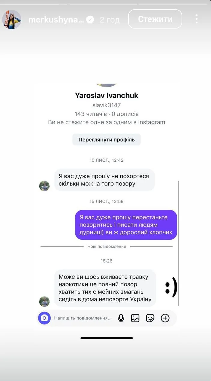 Українська біатлоністка Олександра Меркушина у своєму Instagram опублікувала переписку з вболівальником, який розкритикував її за невдалі виступи.