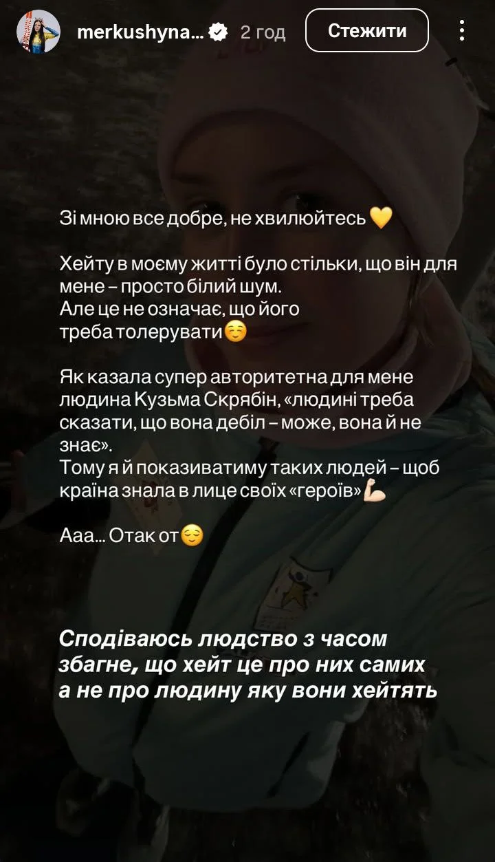 Як казала суперавторитетна для мене людина Кузьма Скрябін, "людині треба сказати, що вона дебіл – може, вона й не знає". Тому я й показуватиму таких людей – щоб країна знала в лице своїх "героїв". Сподіваюсь людство з часом збагне, що хейт – це про них самих, а не про людину, яку вони хейтять", – написала Меркушина.
