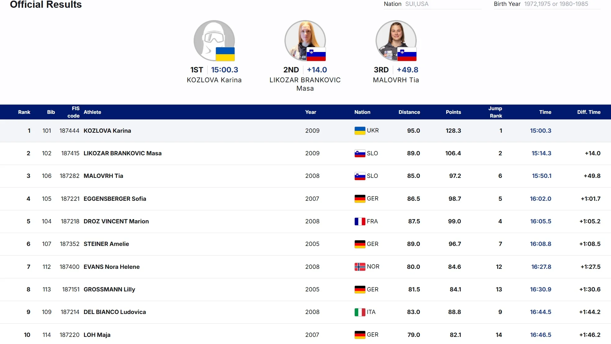 На етапі Інтерконтинентального кубка з лижного двоборства у німецькому Шонахі Козлова показала потужний результат у стрибках з трампліна – заробила 128.3 бала, що принесло їй майже півтори хвилини переваги над найближчою переслідувачкою Масою Лікожар зі Словенії на лижних перегонах.