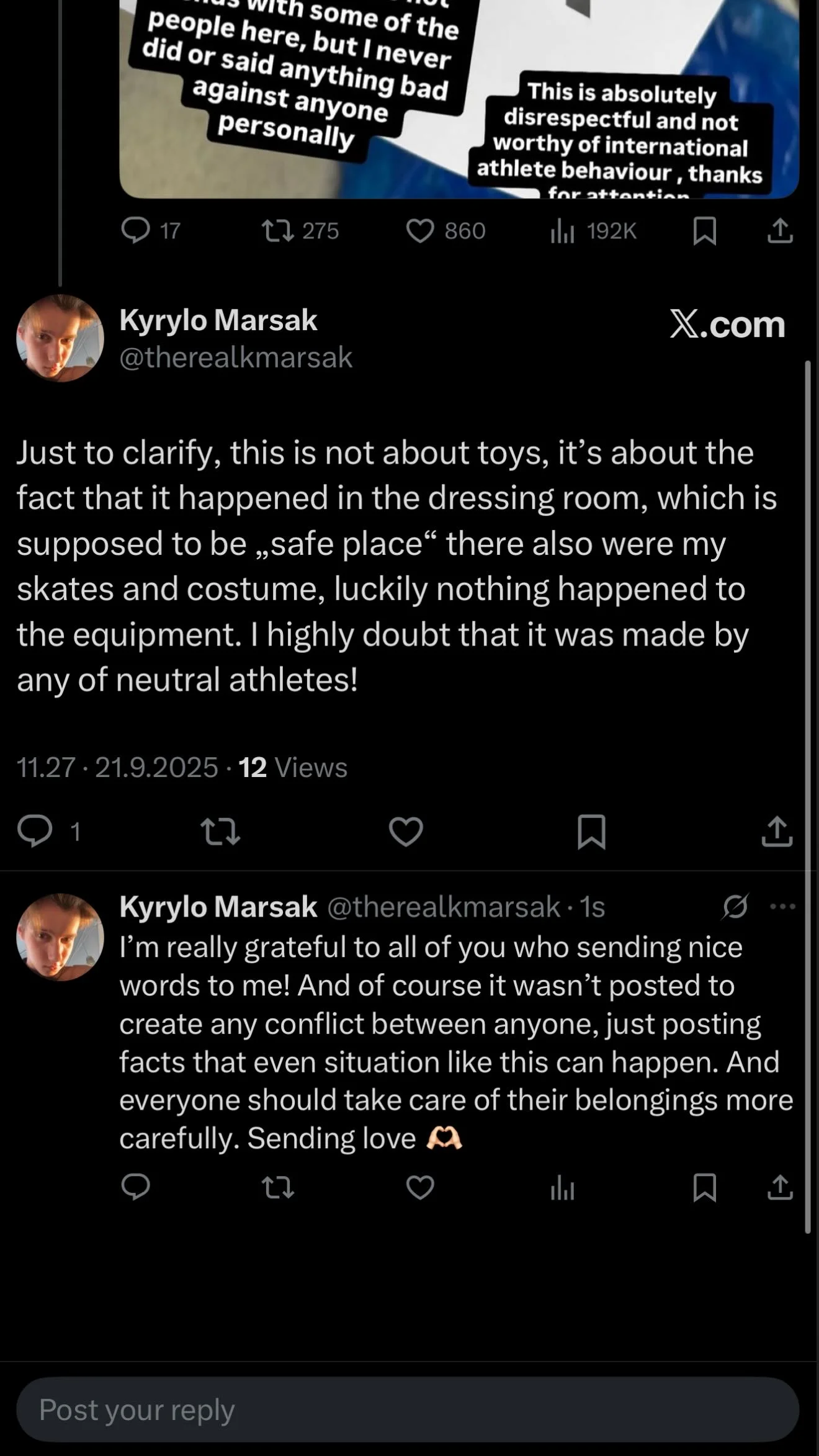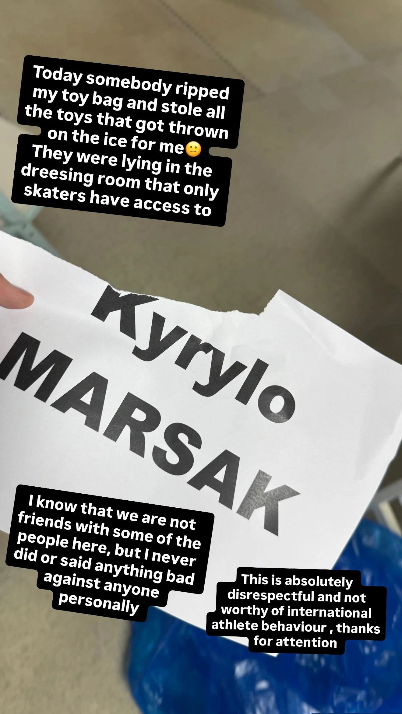 "Хочу уточнити: мова не про іграшки, а про те, що це сталося в роздягальні, яка вважається "безпечним місцем". Там же були мої ковзани й костюм. На щастя, з екіпіровкою нічого не сталося. Дуже сумніваюся, що це зробив хтось із нейтральних спортсменів!
