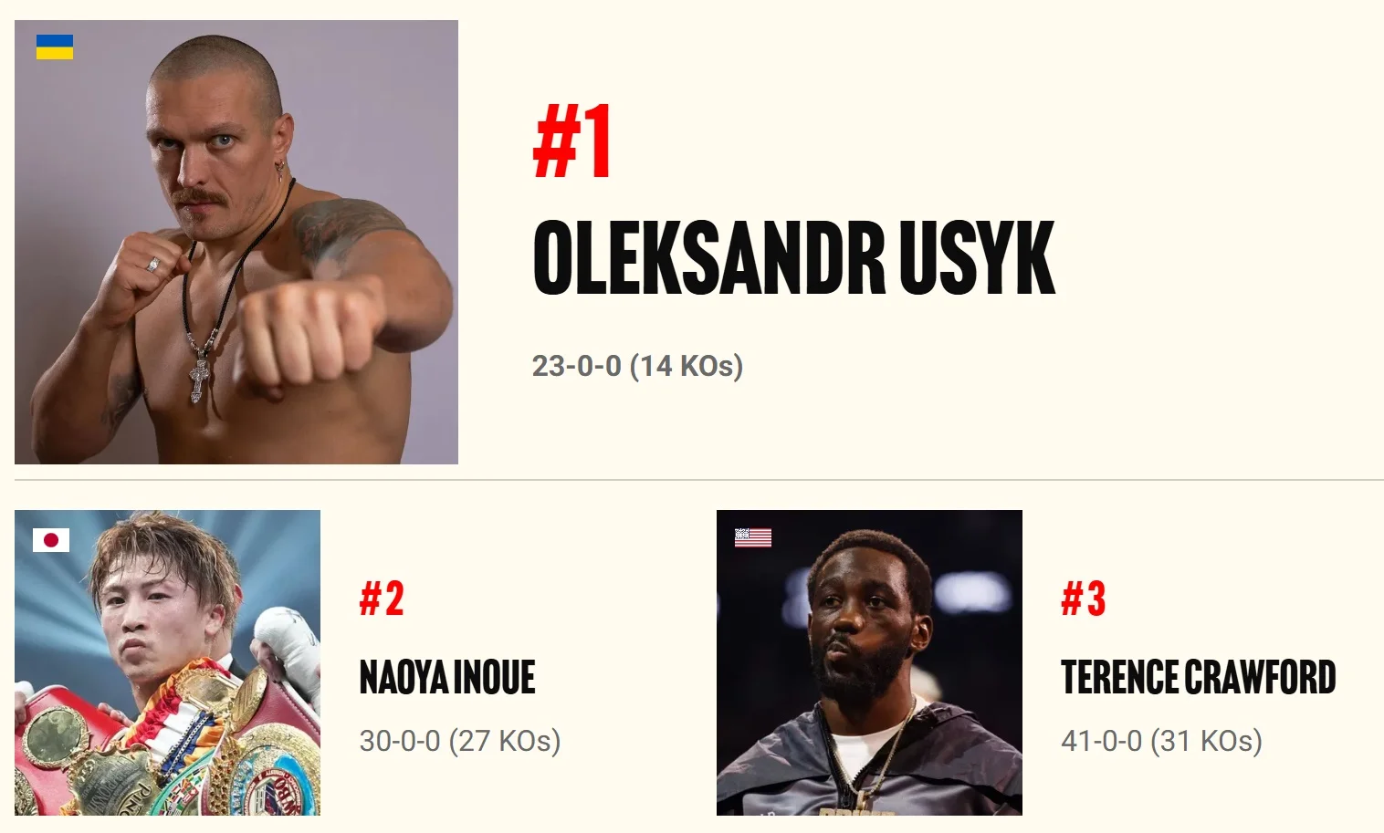 Перше місце, як і раніше, посідає українець Олександр Усик – чинний чемпіон світу в суперважкому дивізіоні за версіями WBA, WBO, WBC, IBO.