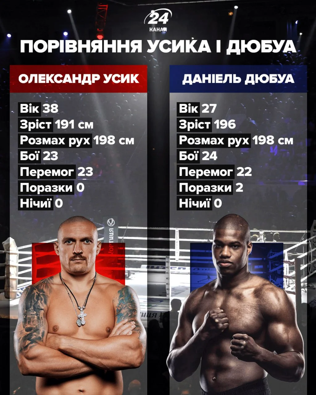 – Дюбуа молодший за Усика на 11 років, але провів на професійному рингу на один бій більше – 24 проти 23. Натомість в українця більше перемог – 23 проти 22.