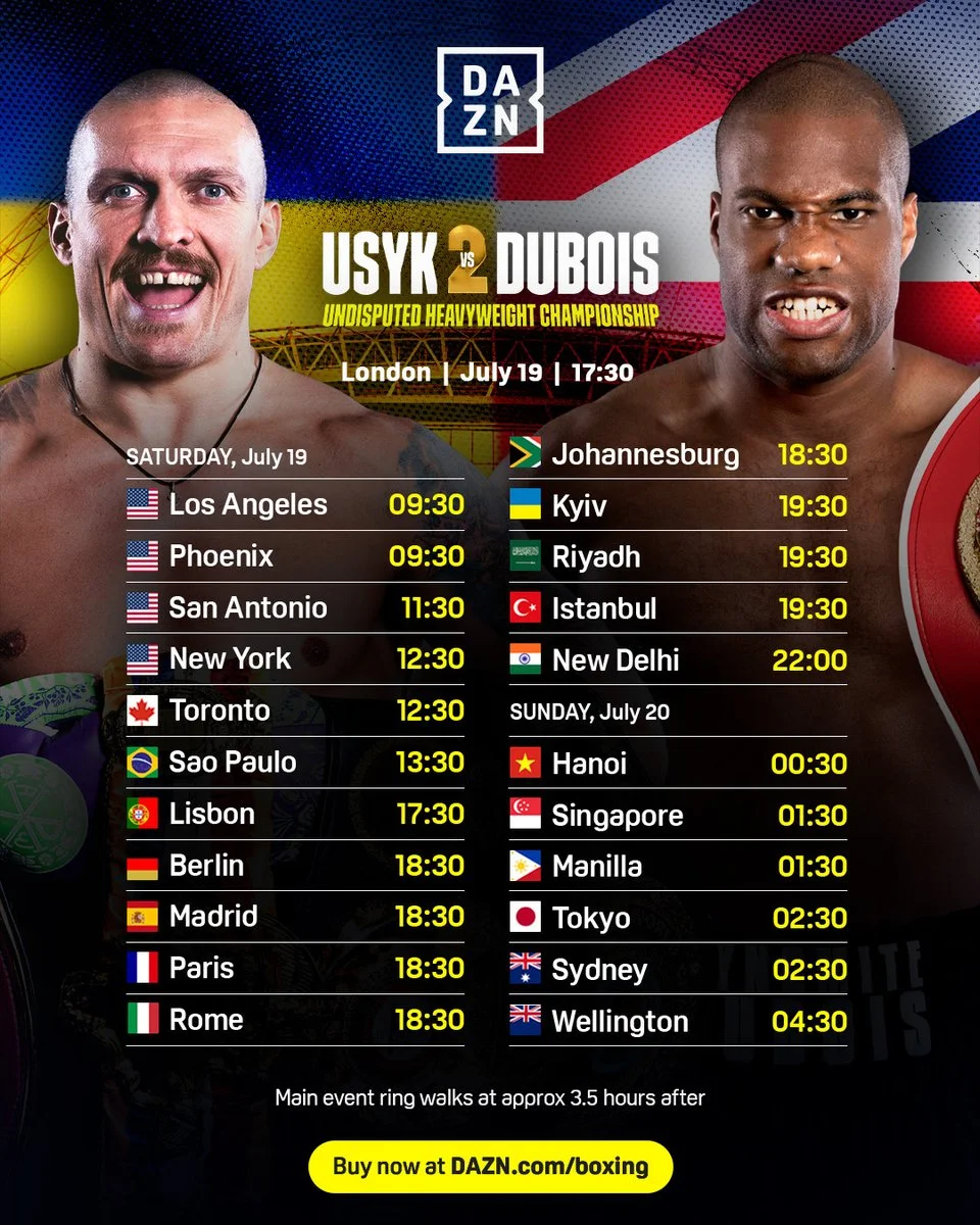 12:15. На відміну від попередніх поєдинків Усика, які часто стартували після опівночі, цей бій розпочнеться раніше. Згідно з регламентом стадіону Вемблі (Лондон), головне протистояння стартує о 23:30 за київським часом 19 липня і має завершитися до 01:00 20 липня. Вечір боксу загалом розпочнеться орієнтовно о 19:00. В Україні стежити за перебігом бою можна буде на платформі MEGOGO за наявності відповідної підписки.