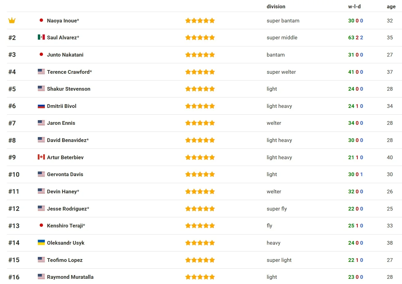 Топ-16 найкращих боксерів сучасності незалежно від вагової категорії за версією BoxRec