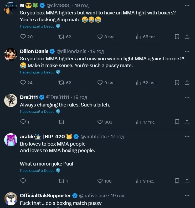 Варто додати, що Джейка Пола знищили у коментарях до цього допису. Майже всі вказують, що блогер вічно викликає бійців ММА на боксерські поєдинки, а тепер хоче викликати чинного боксера на бій ММА. Пригадали йому і досвід виступів на боксерському ринзі, закликавши зустрітись у поєдинку з Усиком на боксерському ринзі.