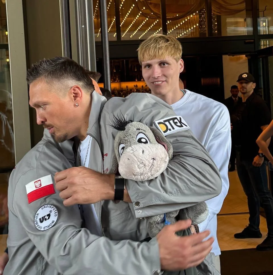 У Великій Британії Олександр Усик з’явився разом зі своїм відомим талісманом – іграшковим віслюком на ім’я Іа. Як відомо, це подарунок боксеру від його доньки Єлизавети. Іа став супутником Усика напередодні другого бою українця проти Ентоні Джошуа та з того часу супроводжує його на всі поєдинки.