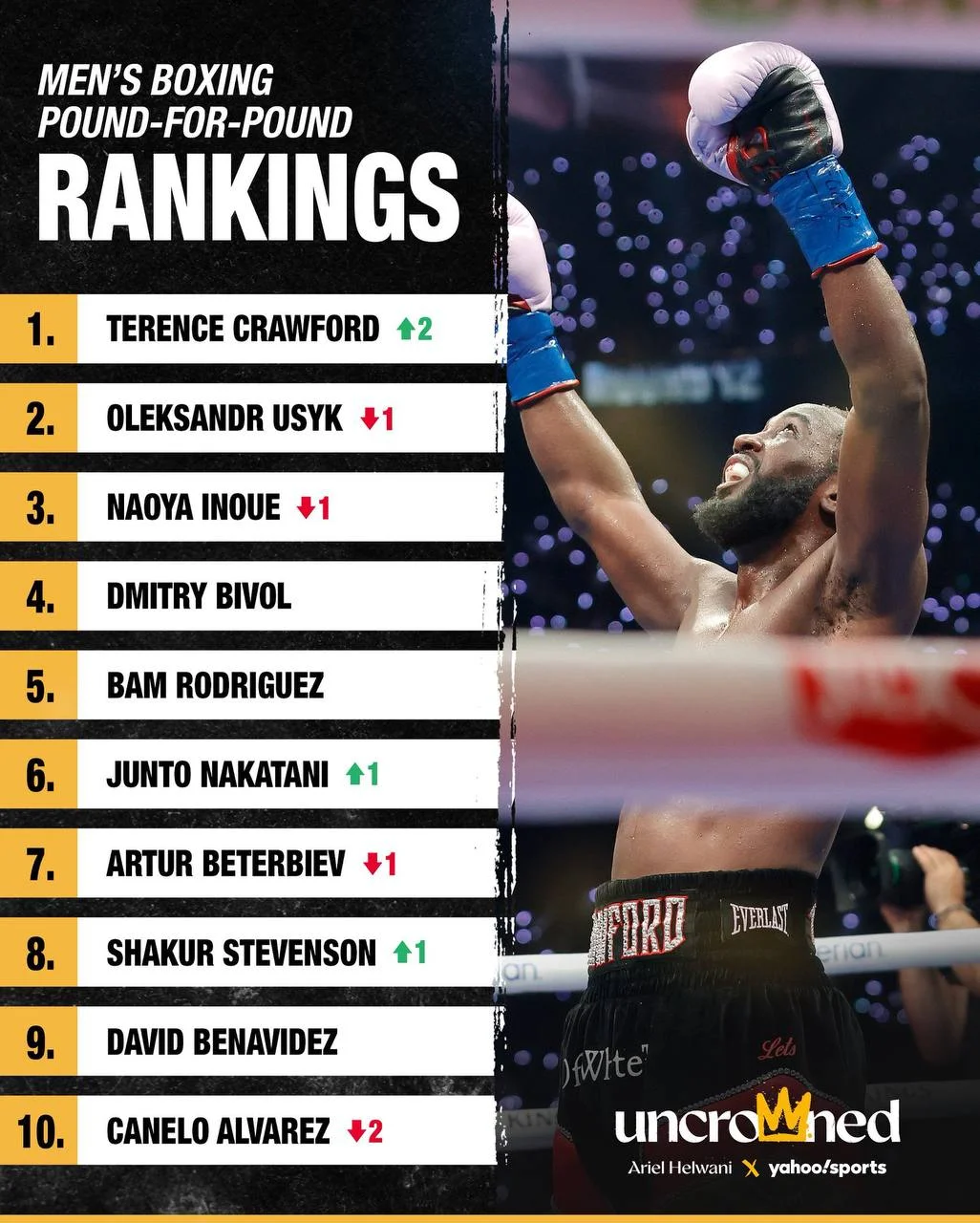 Канело, програвши Кроуфорду, посідає не восьме місце, а десяте. З другої позиції на третю перемістився абсолютний чемпіон світу у другій найлегшій вазі Наоя Іноуе, який 14 вересня переміг представника Узбекистану Муроджона Ахмадалієва