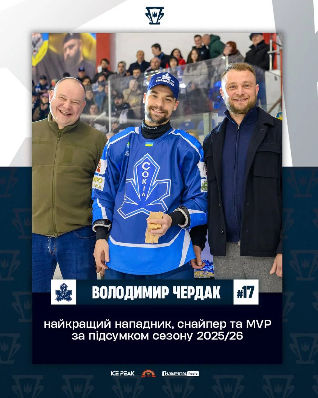 Володимир Чердак став найкращим гравцем сезону в чемпіонаті України з хокею 2025/26.