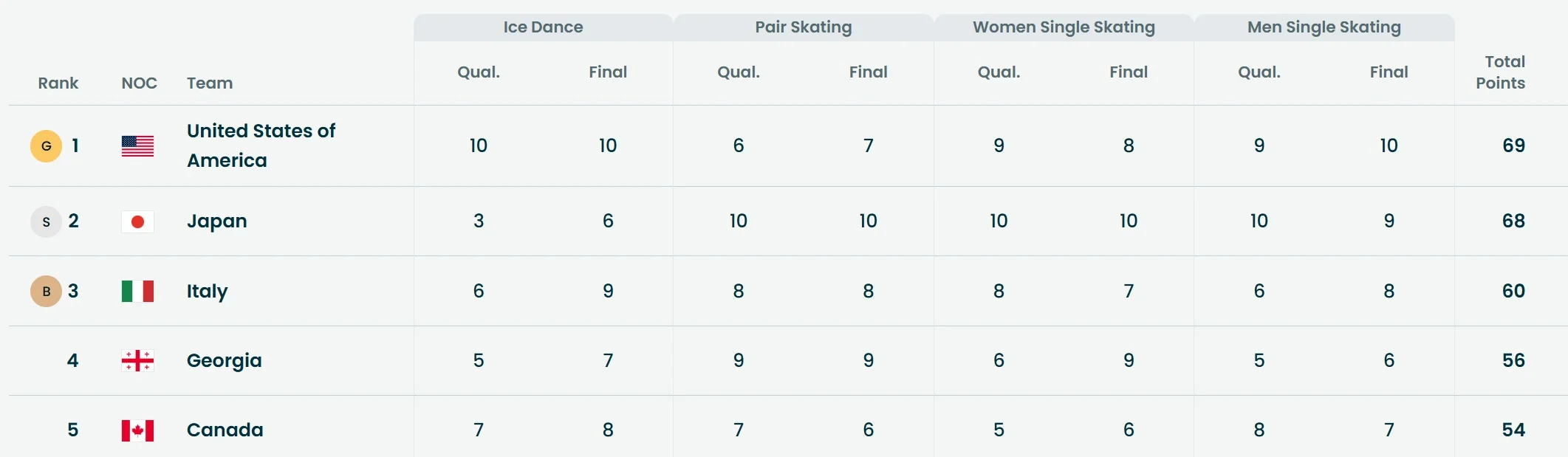 Команди США, Японії, Італії, Грузії та Канади пройшли до вирішальної стадії змагань за підсумками коротких програм у чотирьох дисциплінах: чоловічому й жіночому одиночних катаннях, спортивних парах і танцях на льоду. Перед фінальним етапом американці були лідерами, випереджаючи японців лише на один бал.