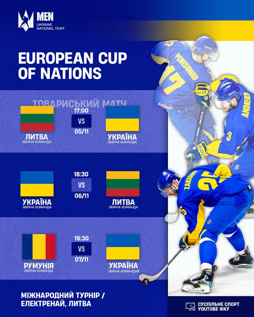 Хокейна збірна України першу гру в прем’єрному розіграші Кубка Європейських націй проведе 6 листопада проти команди Литви, повідомляє ФХУ.
