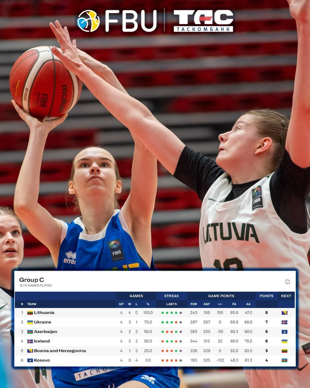 Українська жіноча збірна U-18 зазнала першої поразки на Євробаскеті в дивізіоні В. Після перемог над збірними Косово (62:51), Азербайджану (78:65) та Боснію і Герцеговину (81:76) наші дівчата поступилися Литві з рахунком 46:75.