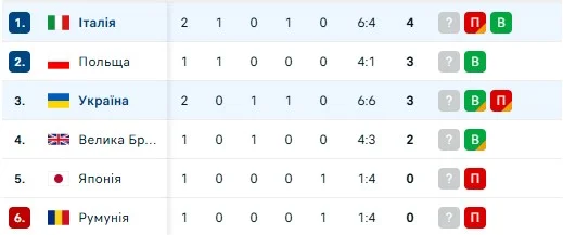 Таким чином, Україна набрала 3 очки та розташувалась на третьому місці в таблиці. Стільки ж має і Польща, яка має гру в запасі, а Італія лишилась першою з 4 балами.