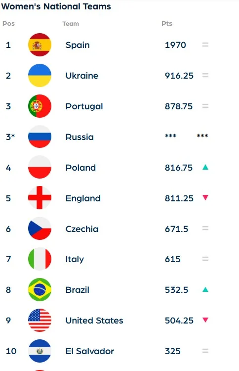 У топ-10 майже не відбулось змін – Іспанія залишається лідером з 1970 очками (в України 916,25). Португалія третя з 878,75 балами. Збірна Росії також присутня у списку на третьому місці – позиції, яку вона посідала до початку повномасштабного вторгнення на територію України.