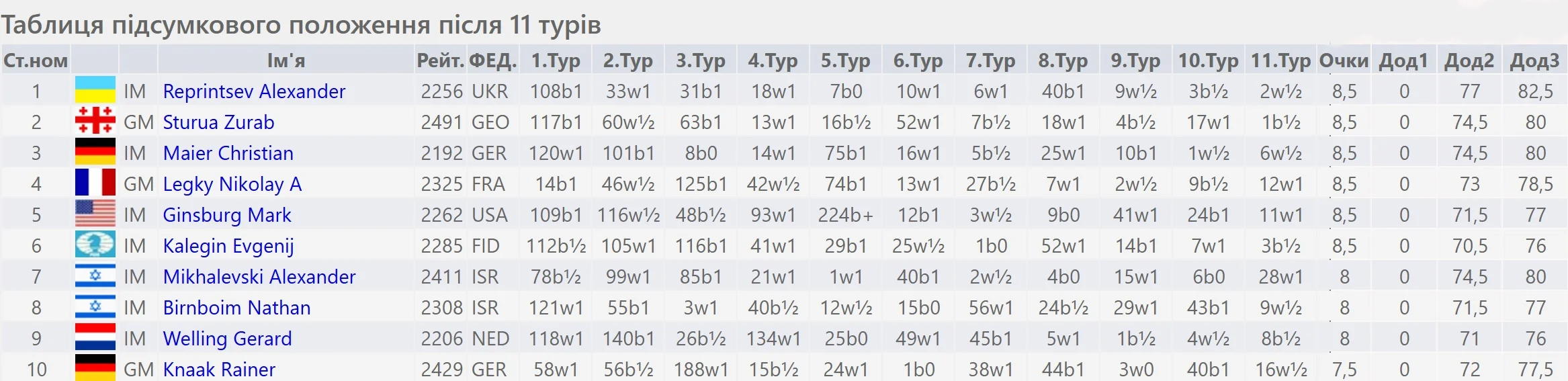 Репринцев набрав 8,5 очка з 11 можливих. Він зазнав однієї поразки, три рази зіграв внічию та здобув 7 перемог. До всього, українець виграв шість партій у восьми перших турах.